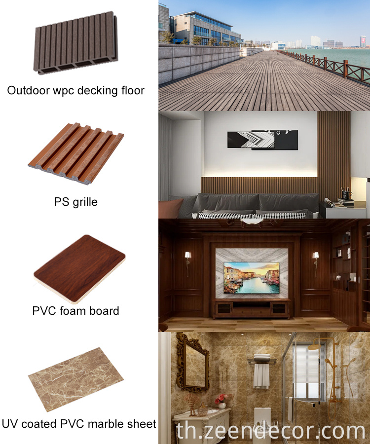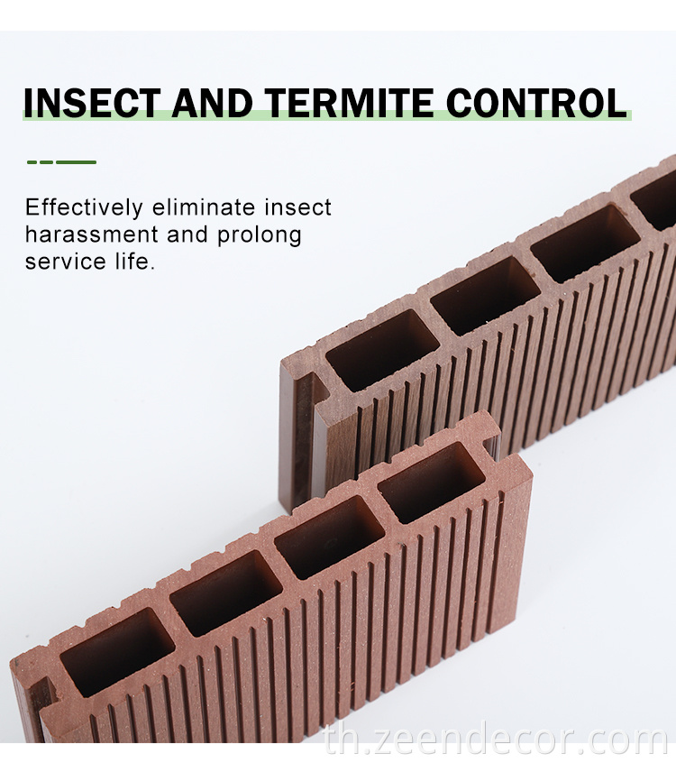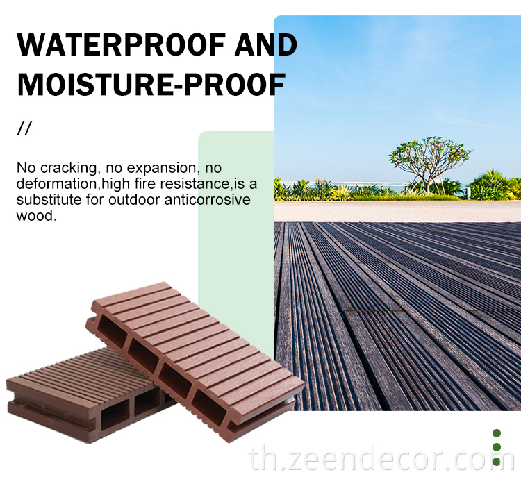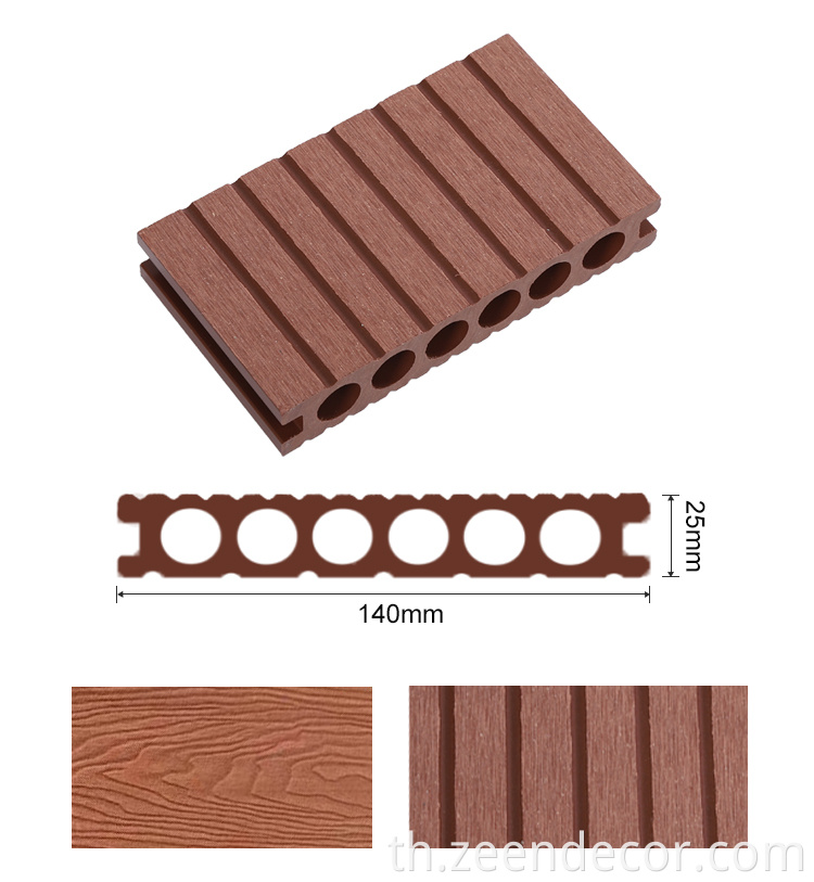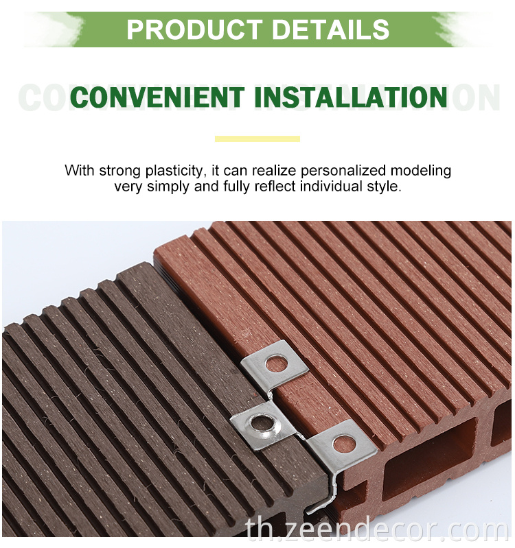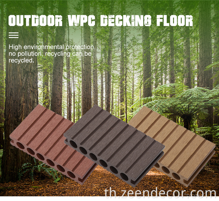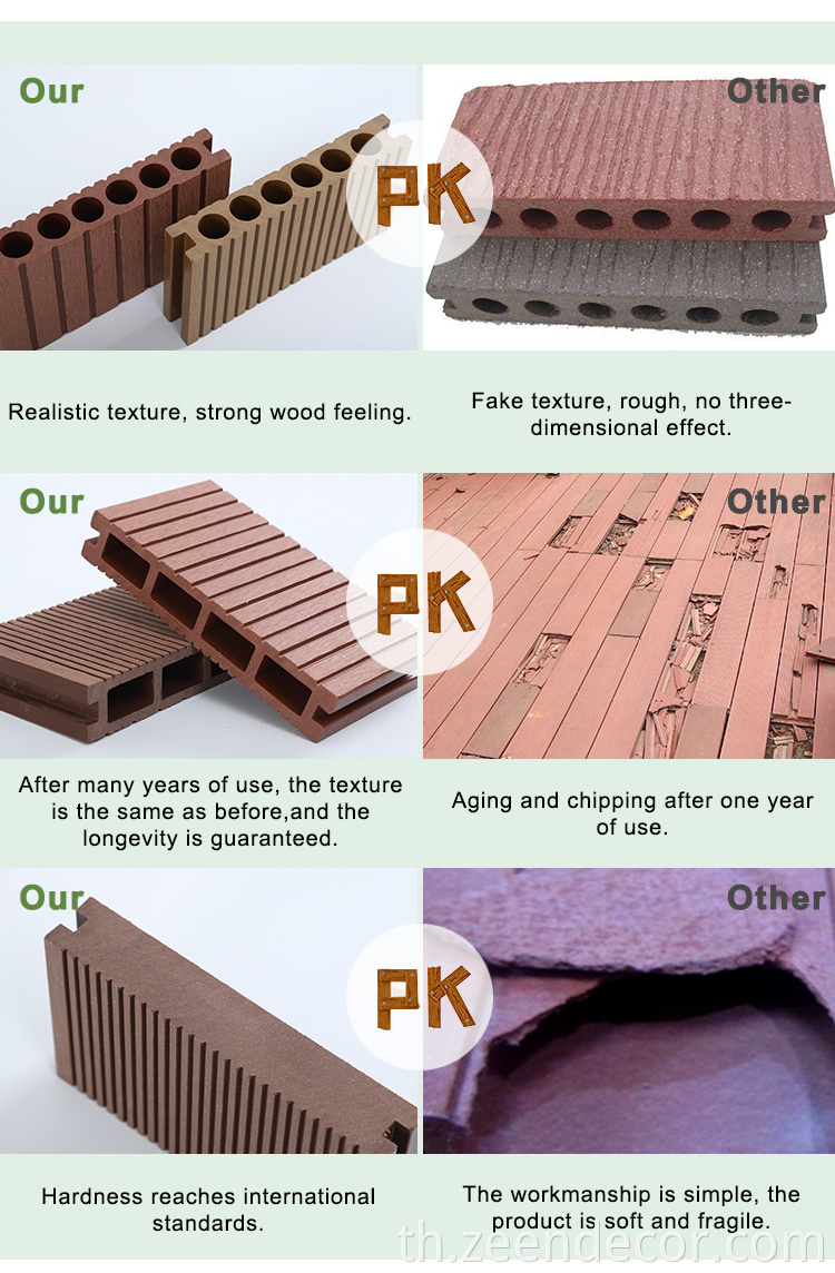WPC คอมโพสิตพื้นดาดฟ้ากลางแจ้ง (พื้น WPC กลางแจ้ง、 พื้นพื้นทึบ、 พื้นไม้ WPC) ทำจากผงไม้ 50%, 30% HDPE (โพลีเอทิลีนความหนาแน่นสูง), 10% pp (พลาสติกโพลีเอทิลีน) ตัวแทนการมีเพศสัมพันธ์, น้ำมันหล่อลื่น, ตัวแทนต่อต้าน UV, ตัวแทนแท็กสี, สารหน่วงไฟและสารต้านอนุมูลอิสระ WPC Composite Decking ไม่เพียง แต่มีพื้นผิวไม้จริงเท่านั้น แต่ยังมีอายุการใช้งานที่ยาวนานกว่าไม้จริงและต้องการการบำรุงรักษาเพียงเล็กน้อย ดังนั้น WPC Composite Decking เป็นทางเลือกที่ดีของพื้นอื่น ๆ